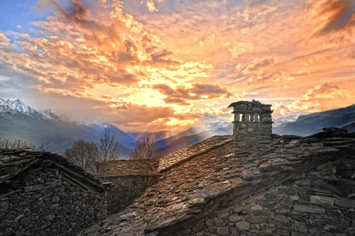 L’ameno villaggio del Gran-Rhun, a circa 1400 metri slm., sembra essere quasi mollemente adagiato su di un grande pianoro posto poco a valle del noto Colle di Joux. Anche da questa frazione, edificata su quella che era anticamente detta La montagne de Saint-Vincent, si aprono ampi orizzonti sull’intera valle centrale percorsa dal fiume Dora e sulle più belle montagne della Valle d’Aosta. Il monte Zerbion con i suoi 2722 metri sembra proteggere dai freddi venti del nord questo ampio comprensorio da cui lo sguardo ammirato si posa sui Monti Lyan e Barbeston, sulla Cima Nera e, proseguendo verso Aosta, si ammira l’imponente piramide del monte Emilius. Tutt’intorno al villaggio del Grand-Rhun la natura si offre nelle diverse stagioni dando il meglio di sé; dalle spettacolari fioriture primaverili, agli intensi colori dell’estate, ai caldi colori dell’autunno fino al bianco immacolato della neve in inverno questo villaggio dà delle sensazioni difficilmente riscontrabili altrove. La campagna circostante è caratterizzata da grandi estensioni di terra coltivata a foraggio e sembra quasi essere un tutt’uno con i bellissimi pascoli e boschi circostanti composti soprattutto da maestosi abeti, larici e pini. Qua e là campi di patate si alternano a piccoli ma prodigiosi orti che ci ricordano la secolare battaglia per la sopravvivenza in montagna compiuta dai residenti. Il sottobosco è di una ricchezza senza uguali: muschi e licheni si alternano a fragoline, mirtilli e lamponi; fiori d’incredibile bellezza si mescolano a felci e ad una varietà di minuscole piante di numerosissime varietà che però nella stagione estiva celano profumatissimi e prelibati funghi porcini. Gli animali selvatici che abitano qui e che possono essere ammirati sono numerosissimi: volpi, cinghiali, caprioli, scoiattoli, passeracei dalle colorate fogge, rumorosi picchi, topini di campagna e minuscole ma laboriose formiche fanno parte di quell’incredibile fauna che vive in questi boschi. Il toponimo Grand-Rhun nasconde senza dubbio un’origine germanofona: Rhun significa, infatti, pianoro verde e questo ben si adatta alla località che, pur con leggerissime variazioni, è sempre rimasto pressoché invariato nel corso dei secoli. Sulle antiche carte redatte in lingua latina il toponimo è indicato nel seguente modo: magno Run. Anche da questo villaggio ci si mobilitò nel 1393 per assicurarsi una parte dell’acqua che sarebbe giunta dal Monte Rosa attraverso il Canale Courtaud o Ru de la montagne de Saint-Vincent: i nominativi di ben sei capifamiglia di Grand-Rhun figurano tra coloro che formarono la primitiva Associazione. I nomi di questi temerari sono: Pierre de Filiey, Aymonet de Cornaz, Aymonin detto Brun, Aymonin Camosini, Germain de Trèves e infine Aymonin figlio di Jacquemin Grand Martin (quest’ultimo ebbe anche un importante incarico dirigenziale nel cantiere che si andava istituendo). Come gli altri Associati anche questi parteciparono in prima persona alla costruzione della titanica opera e così come per gli altri villaggi anche Grand-Rhun godette i frutti di questo imponente lavoro utilizzando l’acqua che era loro garantita dal Ramo B del Canale nella giornata di giovedì. Nel 1422, grazie all’amore del loro signore e per la non trascurabile somma di 200 fiorini d’oro, furono concessi in feudo agli abitanti dei villaggi collinari tutti i territori appartenenti al potente signore Francesco di Challant che di lì a poco sarebbe diventato primo conte di quella nobile casata; in cambio tutti i beneficiari si impegnarono a pagare regolarmente i tributi e a rispettare le norme consuetudinarie (in proposito: G. Forte, Frammenti di storia. La reconnaissance del 1502, Aosta, 1993); tra i beneficiati figurano numerosi capifamiglia di Grand-Rhun e questo permette di accertare che il villaggio è sempre stato intensamente abitato. La concessione in questione ebbe però una breve durata perché nel 1438 Francesco vendette il feudo di Saint-Vincent, unitamente ad altri beni immobiliari, al Duca di Savoia e con il denaro ricavato costituì la dote alle figlie Caterina e Margherita. Nel 1438 il passaggio di proprietà impose una nuova tassazione, che fu rinnovata nel 1440, nel 1455 e nel 1502 creando problemi economici alle famiglie che già non disponevano di grandi risorse finanziarie anche se dai documenti si ricava un'informazione parallela secondo cui la cerealicoltura, molto diffusa su quel territorio, dava alle famiglie dei discreti introiti. Altre concessioni feudali furono rinnovate successivamente; negli archivi del Comune vi sono alcuni registri all’interno dei quali è detto che anche i capifamiglia di Grand-Rhun dovettero rinnovare nel 1599 (al conte Louis du Solar de Moretta) e nel 1646 e 1655 (al conte Perrone di San Martino) gli atti di riconoscenza circa il possesso di beni. Per chiudere questo argomento molto “spinoso” ricordiamo che nel 1748 ben 225 proprietari-contribuenti, molti dei quali abitanti sulla collina, estingueranno i tributi feudali con Charles-François Perrone, signore di Saint-Vincent e tra loro figurano i nominativi di persone residenti a Grand-Rhun. Questa lunga “chiacchierata storica” ci introduce in un altro argomento molto importante riguardante l’economia di quel villaggio che, come già accennato, si basava essenzialmente sulla coltura dei cereali anche se altrettanto importanti erano le coltivazioni della canapa e il commercio del legname con il taglio degli alberi per la produzione di carbone o per la vendita. Naturalmente anche l’allevamento del bestiame con la conseguente fabbricazione di formaggi e latticini aveva un suo punto di forza nell’economia delle famiglie. Il villaggio oggi si presenta come un grande centro composto di numerosissime abitazioni che hanno la particolarità d’essere tutte addossate le une alle altre per difendersi dal freddo dell’inverno. Spessi muri sono sormontati da tetti con falde molto aggettanti; il s