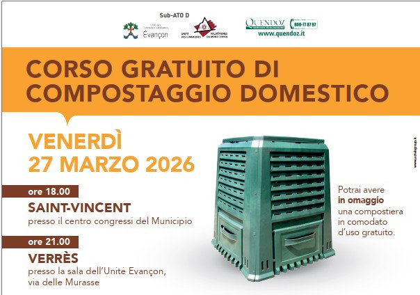 Venerdì 27 marzo 2026 alle ore 18.00 presso il Centro Congressi comunale si terrà il corso di compostaggio domestico gratuito organizzato dal Sub-ATO D in collaborazione co la ditta Quendoz.