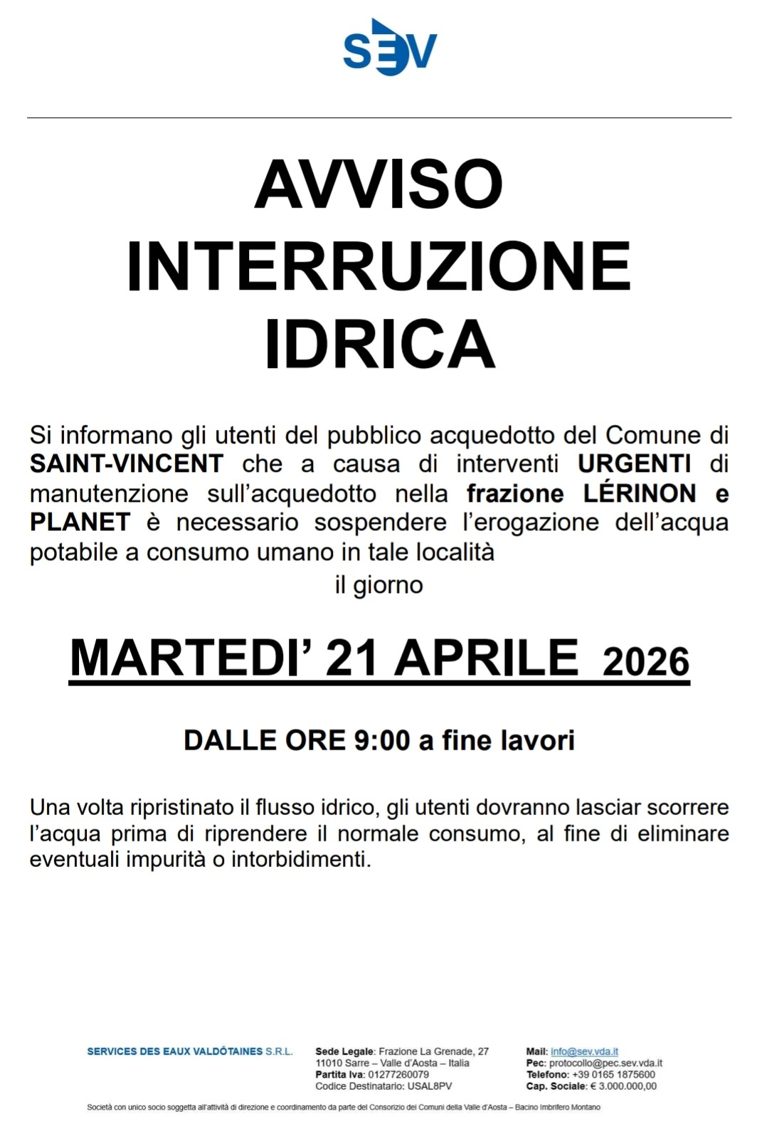 Si informano gli utenti del pubblico acquedotto del Comune di Saint-Vincent che, a causa di interventi URGENTI di manutenzione sull'acquedotto, MARTEDI' 21 APRILE 2026 dalle ore 09:00 e fino alla fine dei lavori è necessario sospendere l'erogazione dell'acqua potabile a consumo umano nelle frazioni LERINON e PLANET.